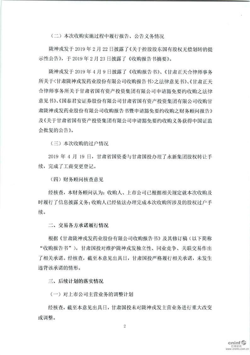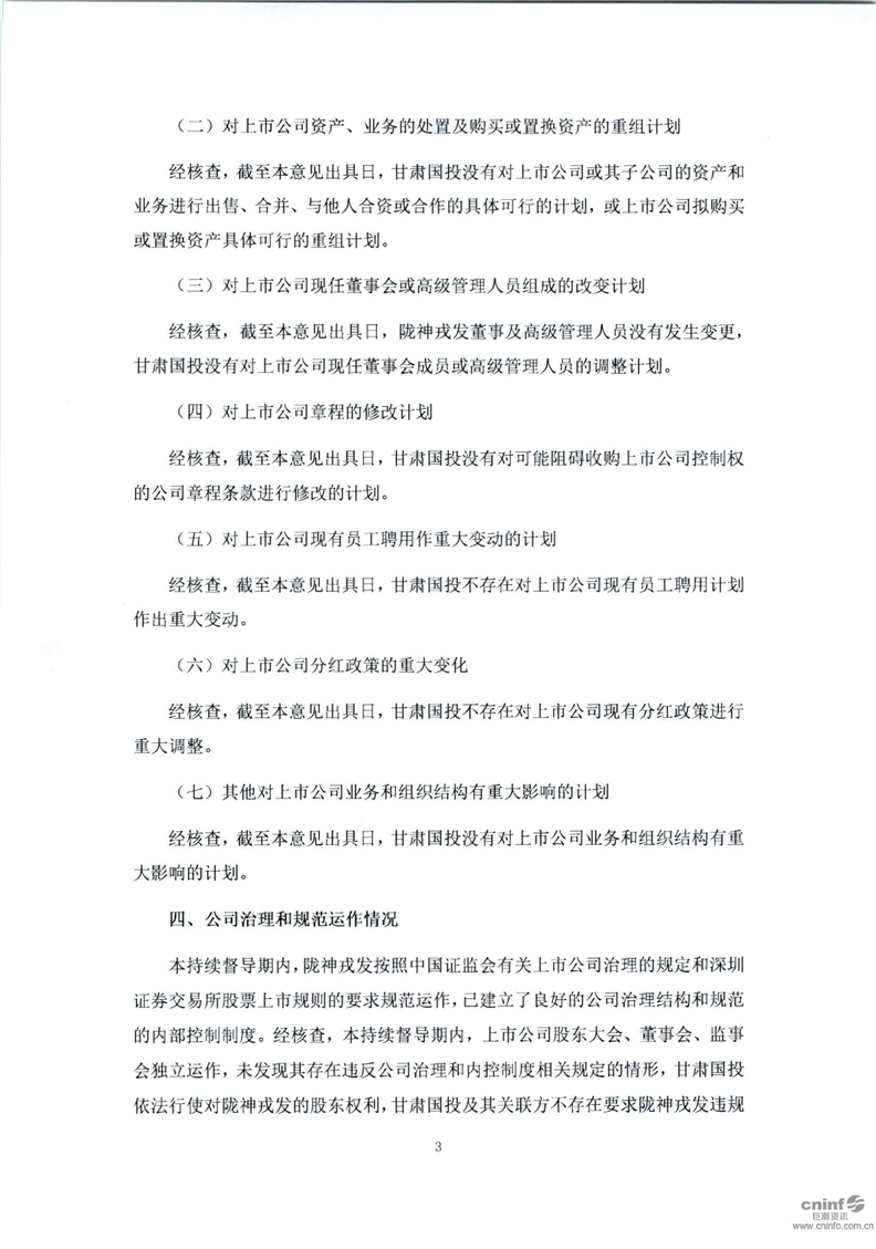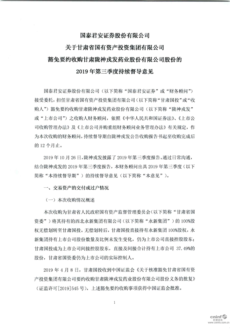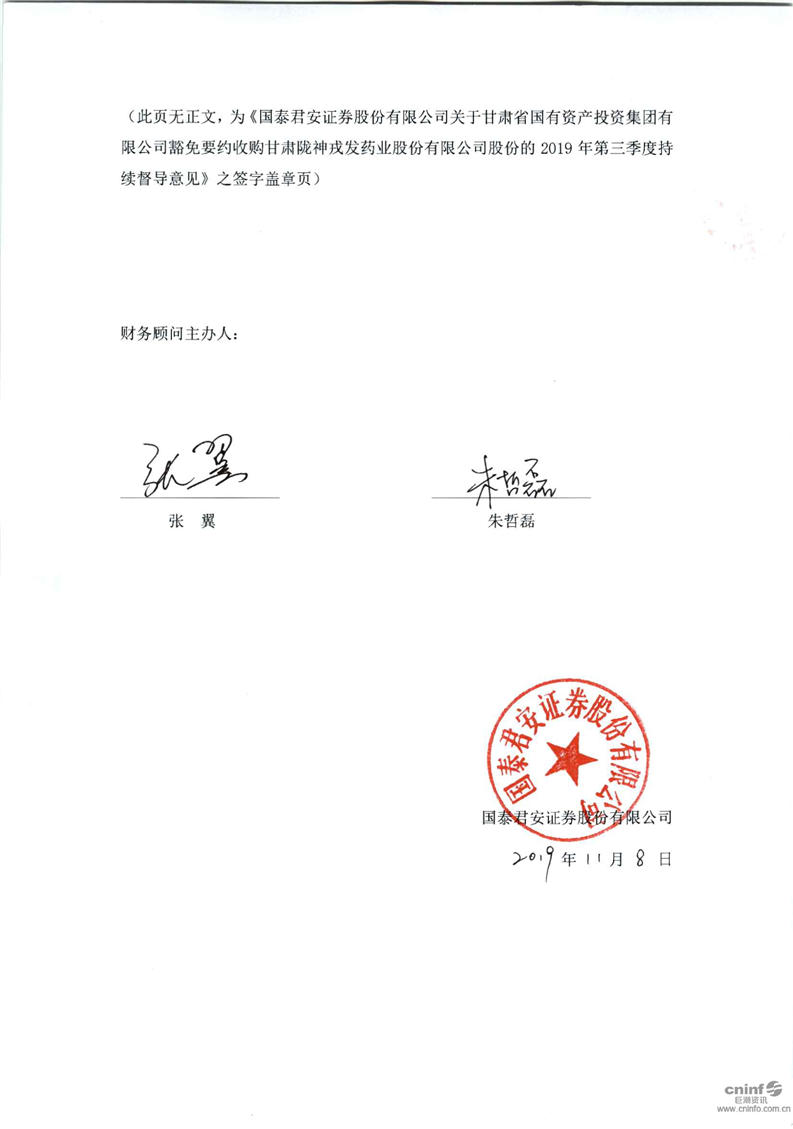 國泰君安證券股份有限公司關(guān)于甘肅省國有資產(chǎn)投資集團有限公司豁免要約收購公司股份的2019年第三季度持續(xù)督導(dǎo)意見