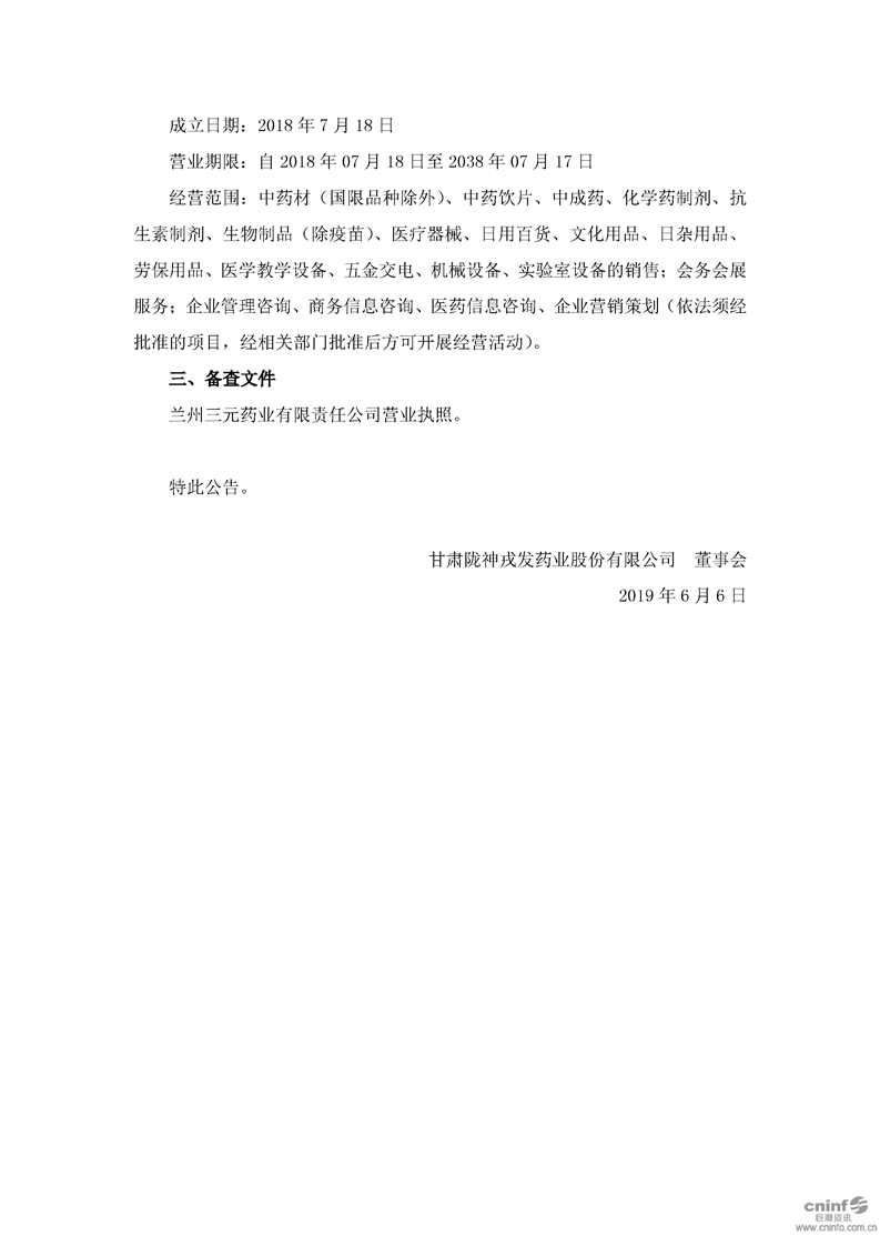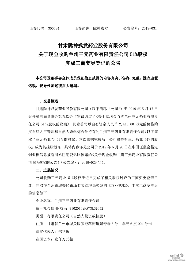 關于現(xiàn)金收購蘭州三元藥業(yè)有限責任公司51%股權完成工商變更登記的公告