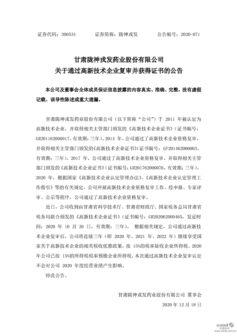 關(guān)于通過高新技術(shù)企業(yè)復(fù)審并獲得證書的公告