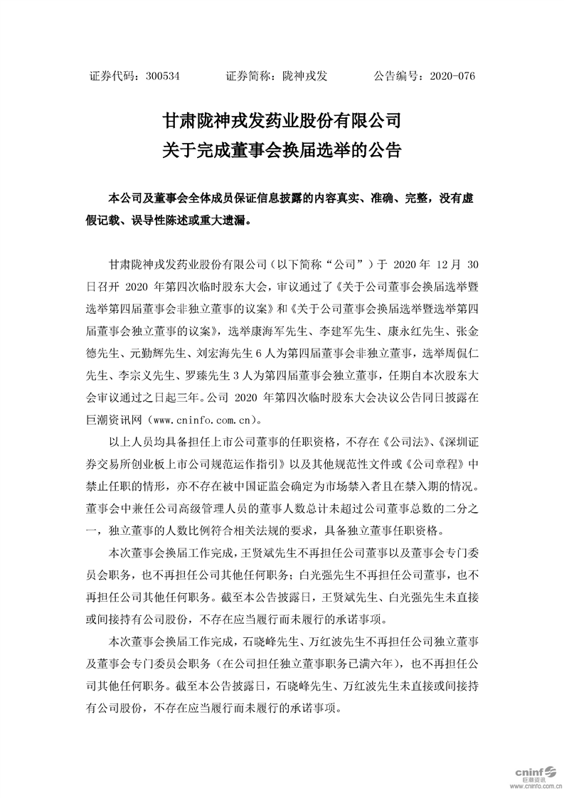 關(guān)于完成董事會(huì)換屆選舉的公告