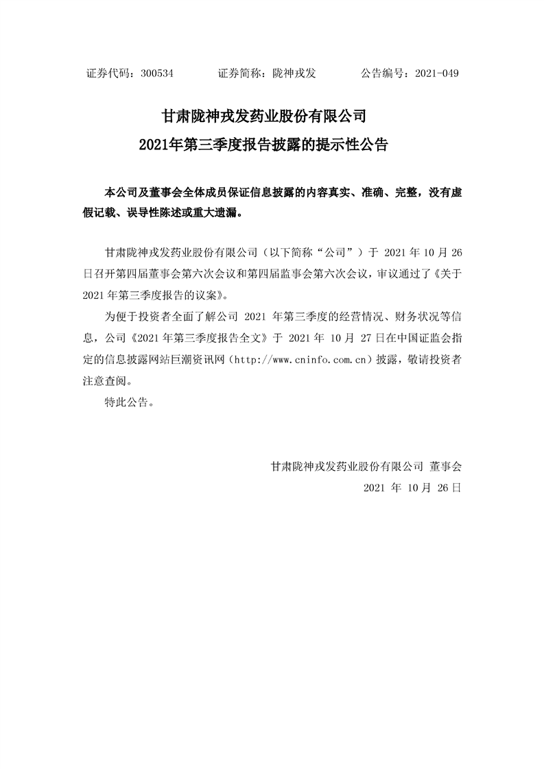 2021年第三季度報告披露的提示性公告