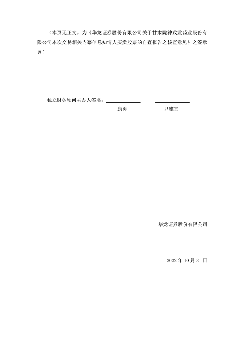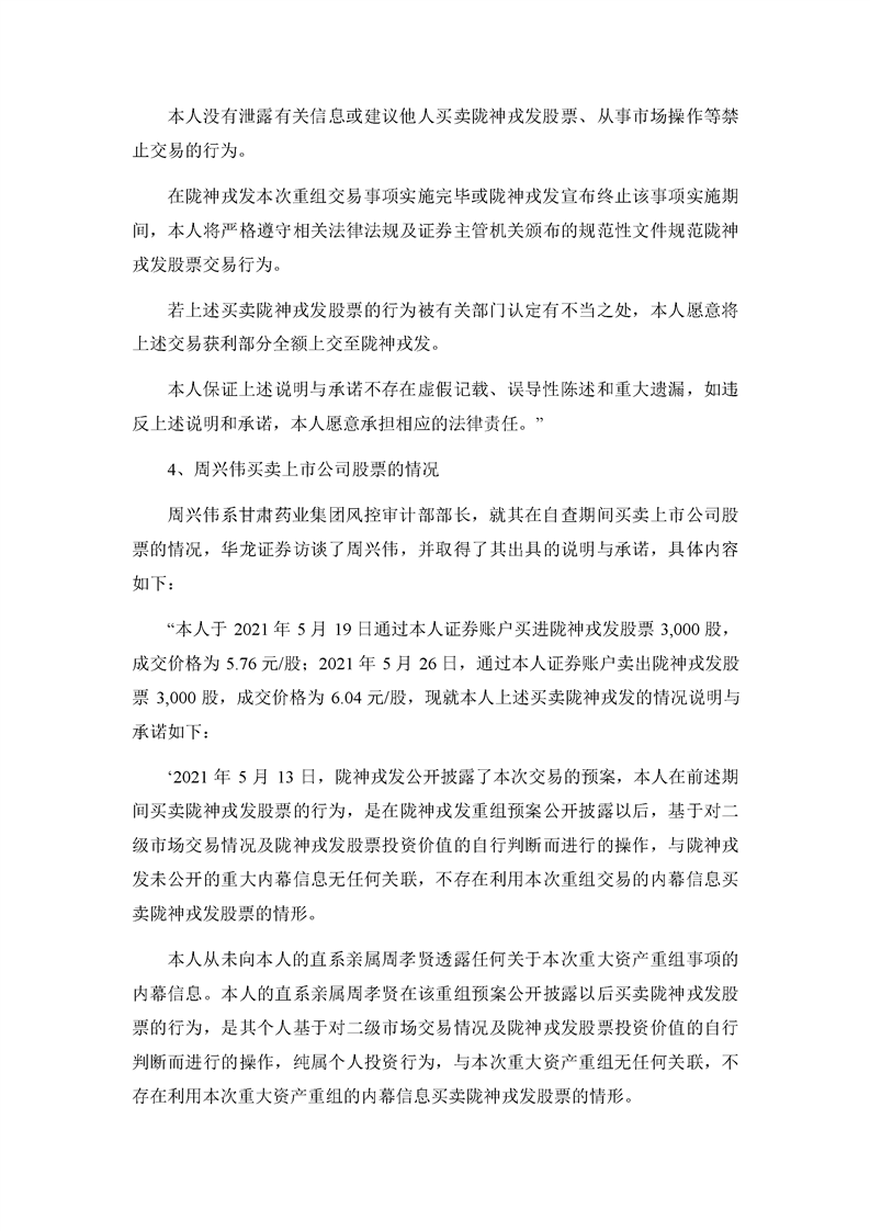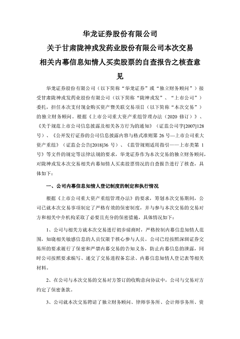 華龍證券股份有限公司關(guān)于甘肅隴神戎發(fā)藥業(yè)股份有限公司本次交易相關(guān)內(nèi)幕信息知情人買賣股票的自查報告之核查意見