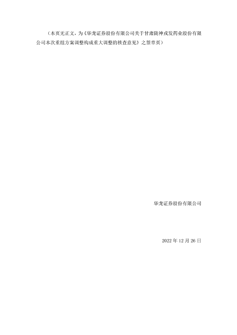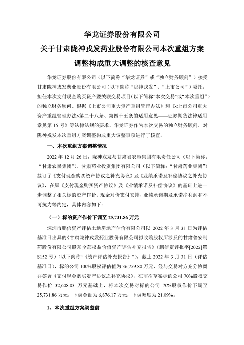 華龍證券股份有限公司關(guān)于甘肅隴神戎發(fā)藥業(yè)股份有限公司本次重組方案調(diào)整構(gòu)成重大調(diào)整的核查意見(jiàn)