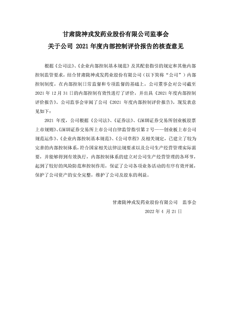 監(jiān)事會關于公司2021年度內(nèi)部控制評價報告的核查意見