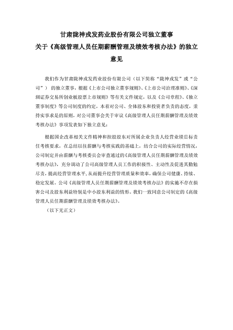 獨(dú)立董事關(guān)于《高級(jí)管理人員任期薪酬管理及績效考核辦法》的獨(dú)立意見