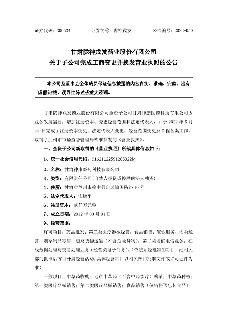 關(guān)于子公司完成工商變更并換發(fā)營(yíng)業(yè)執(zhí)照的公告