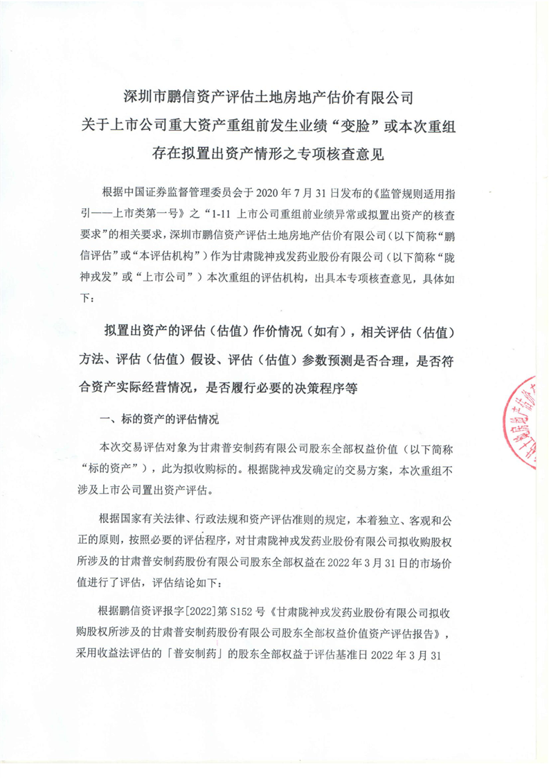 深圳鵬信資產(chǎn)評(píng)估公司關(guān)于上市公司重大資產(chǎn)重組前發(fā)生業(yè)績(jī)變臉或本次重組存在擬置出資產(chǎn)情形之專(zhuān)項(xiàng)核查意見(jiàn)