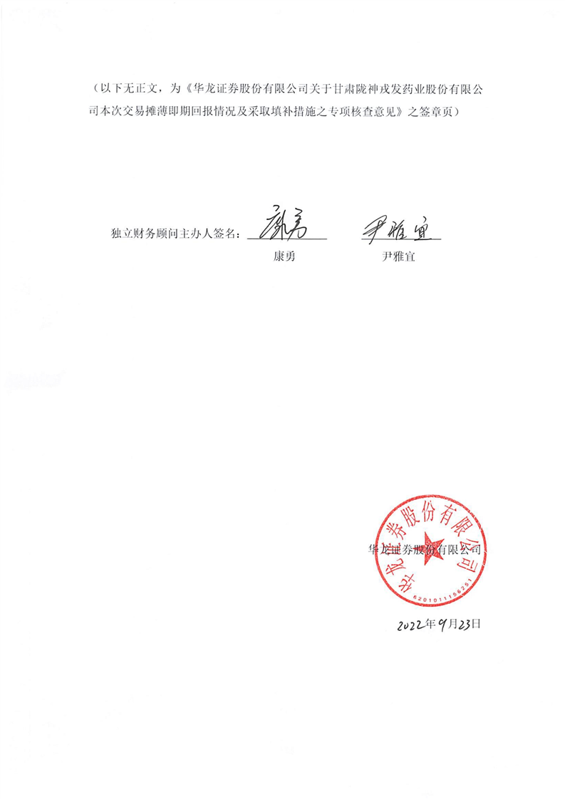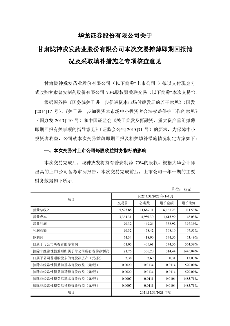 華龍證券股份有限公司關(guān)于甘肅隴神戎發(fā)藥業(yè)股份有限公司本次交易攤薄即期回報(bào)情況及采取填補(bǔ)措施之專(zhuān)項(xiàng)核查意見(jiàn)