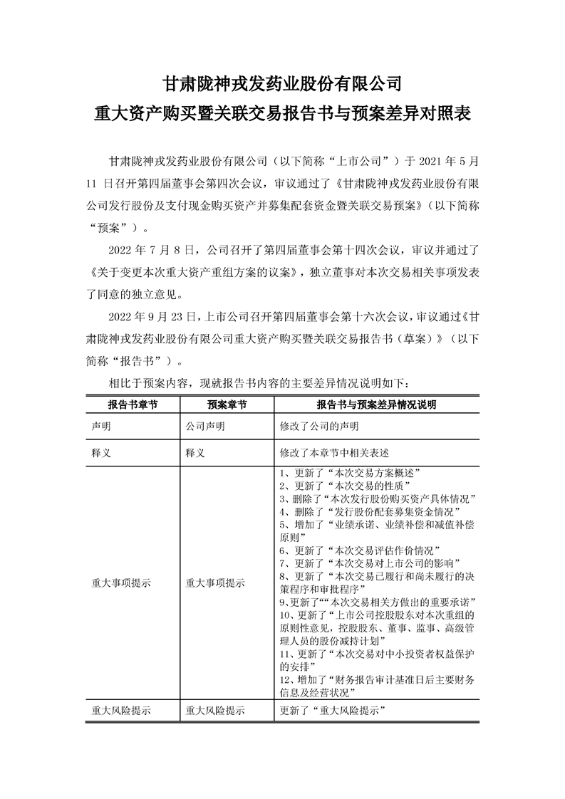 甘肅隴神戎發(fā)藥業(yè)股份有限公司重大資產(chǎn)購買暨關(guān)聯(lián)交易報告書與預(yù)案差異對照表