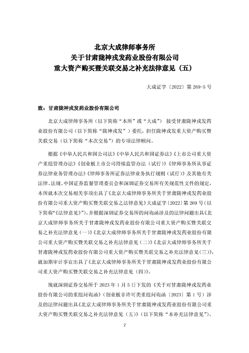 北京大成律師事務(wù)所關(guān)于甘肅隴神戎發(fā)藥業(yè)股份有限公司重大資產(chǎn)購買暨關(guān)聯(lián)交易補充法律意見(五)