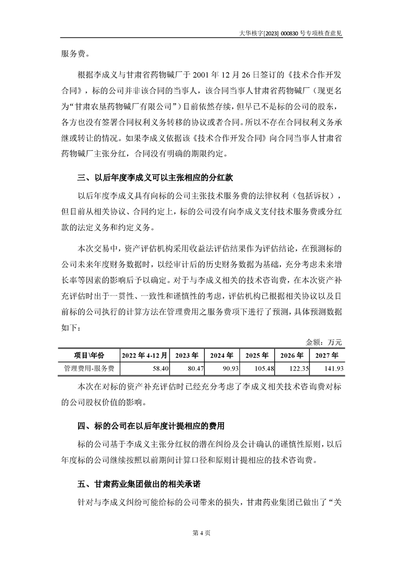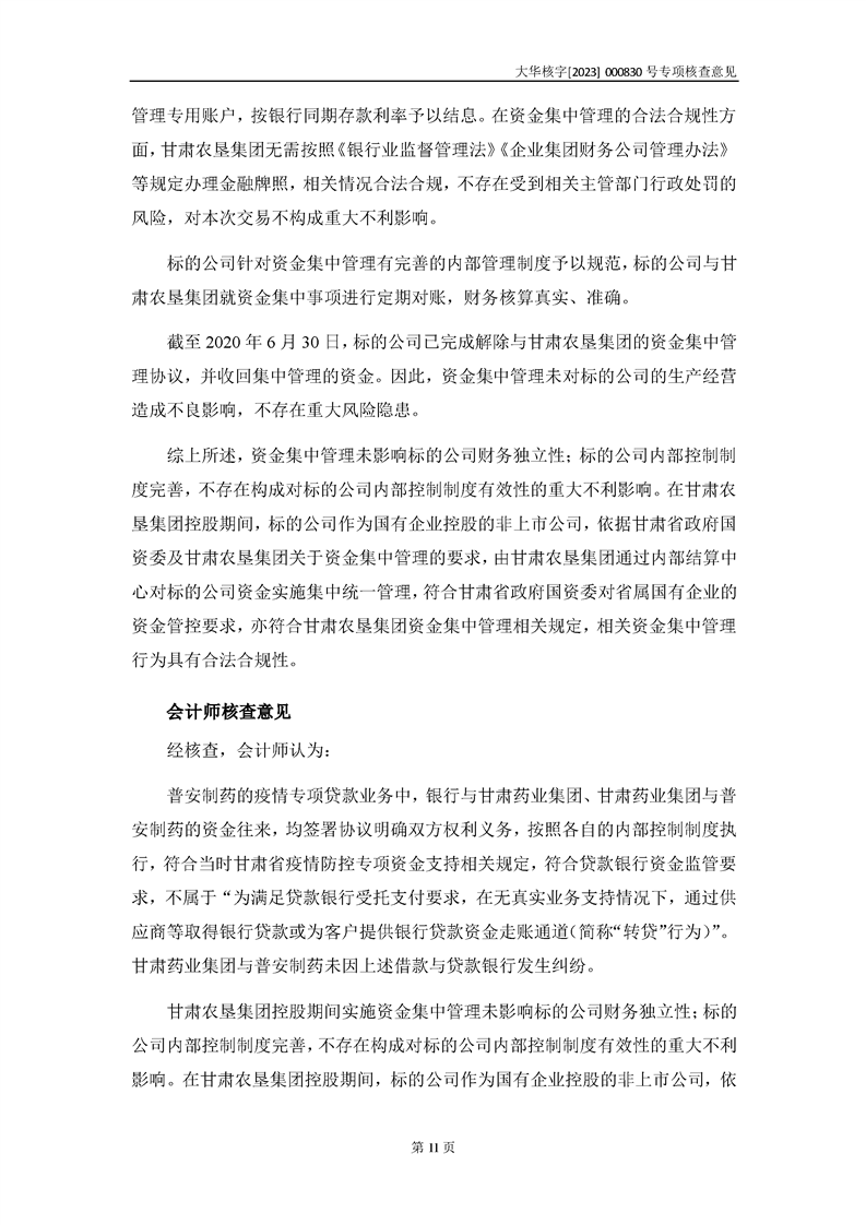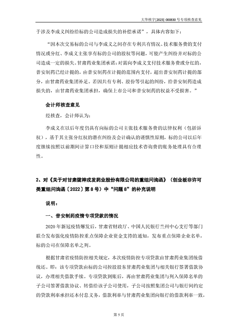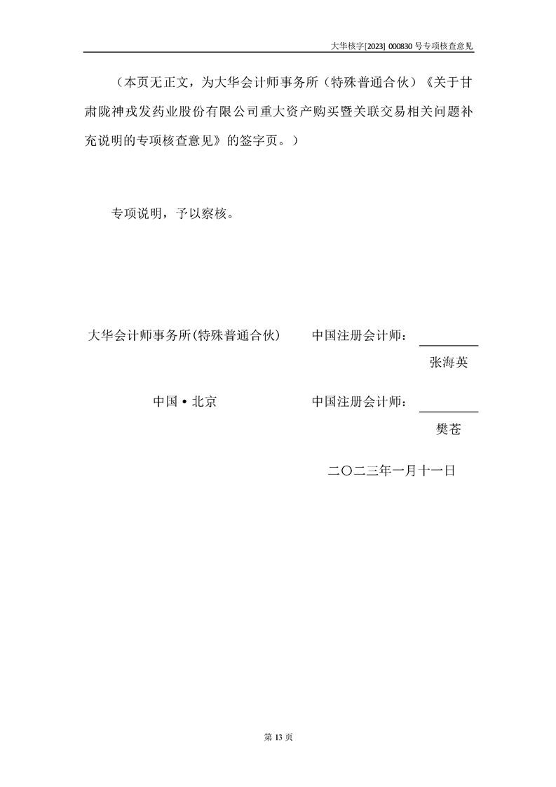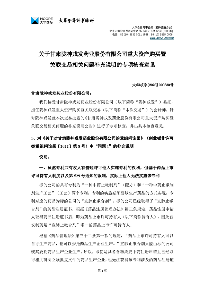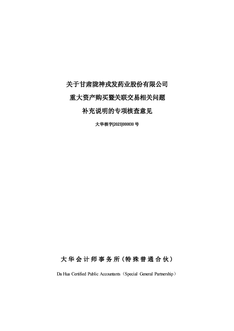大華會計師事務(wù)所關(guān)于甘肅隴神戎發(fā)藥業(yè)股份有限公司重大資產(chǎn)購買暨關(guān)聯(lián)交易相關(guān)問題補(bǔ)充說明的專項核查意見--大華核字[2023]000830號
