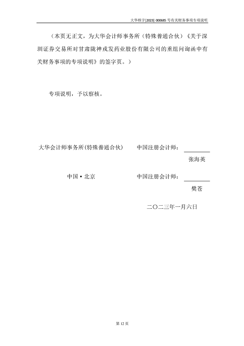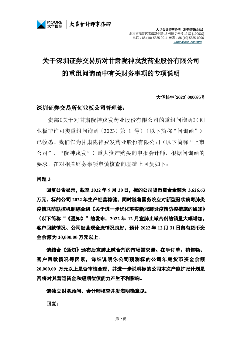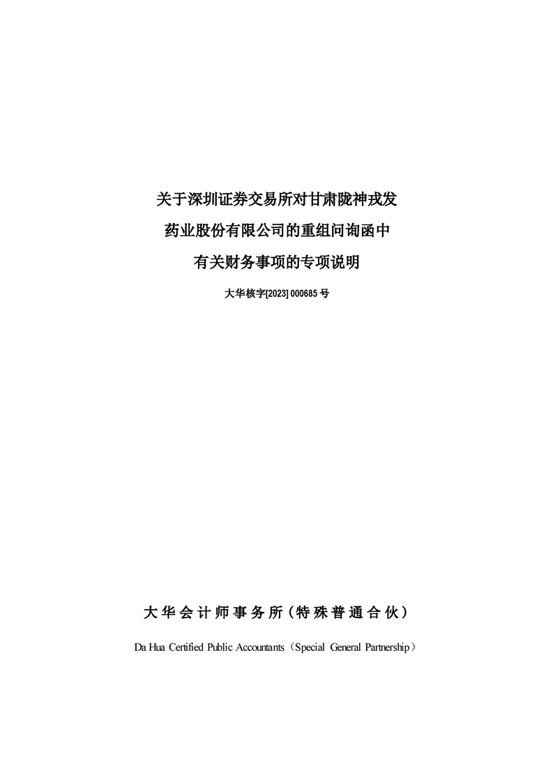 大華會計師事務(wù)所關(guān)于深圳證券交易所對甘肅隴神戎發(fā)藥業(yè)股份有限公司的重組問詢函中有關(guān)財務(wù)事項(xiàng)的專項(xiàng)說明-大華核字[2023]000685號