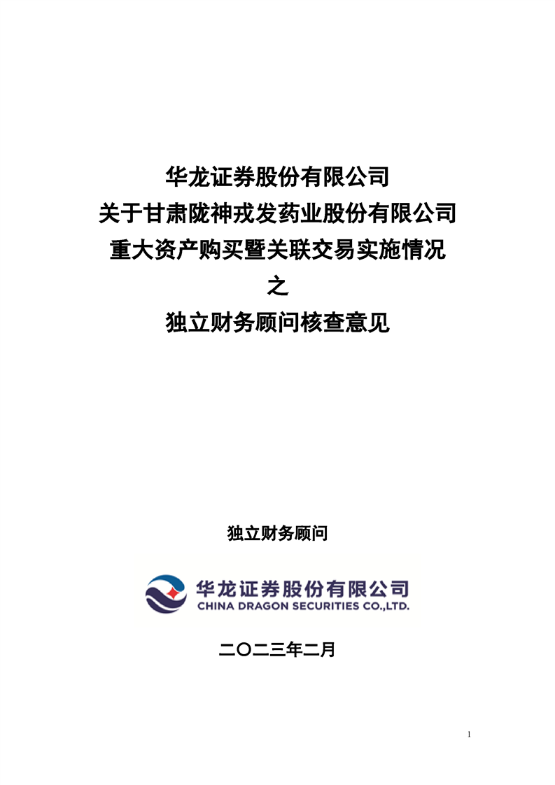 華龍證券股份有限公司關(guān)于甘肅隴神戎發(fā)藥業(yè)股份有限公司重大資產(chǎn)購買暨關(guān)聯(lián)交易實施情況之獨立財務(wù)顧問核查意見