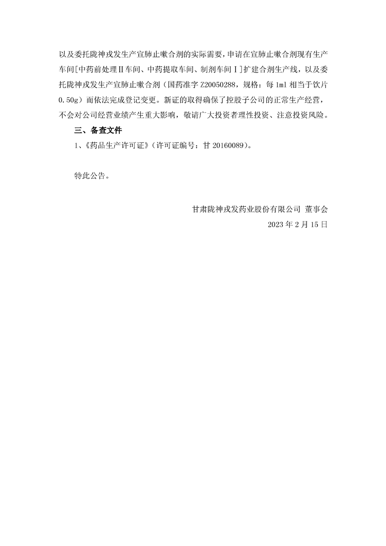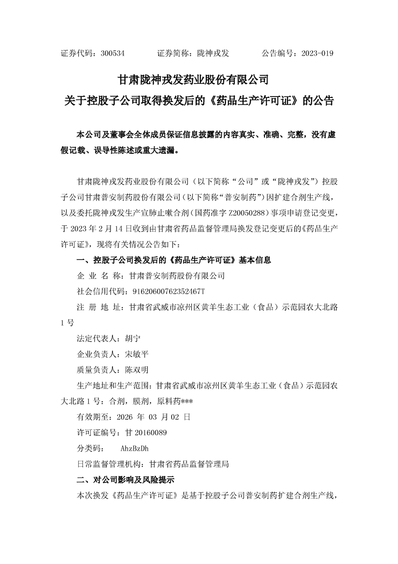 關(guān)于控股子公司取得換發(fā)后的《藥品生產(chǎn)許可證》的公告