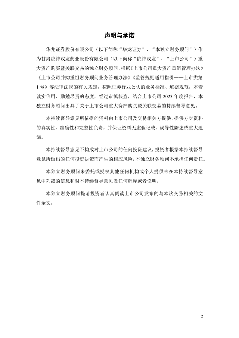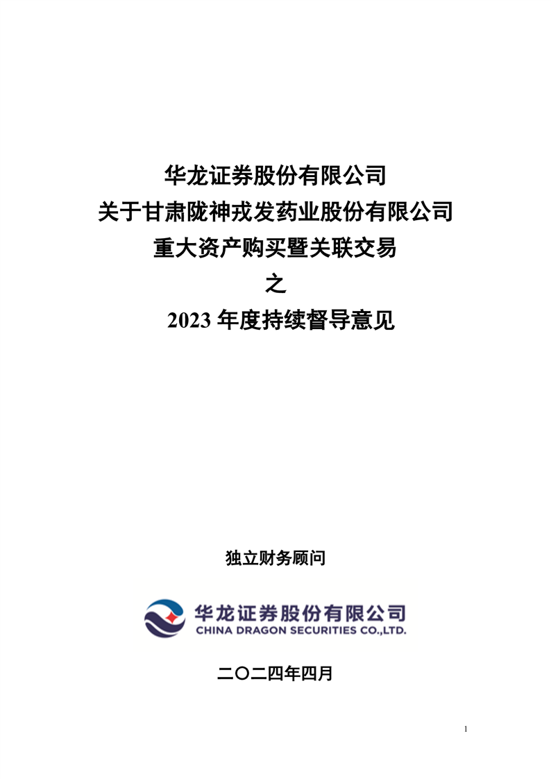 華龍證券股份有限公司關(guān)于甘肅隴神戎發(fā)藥業(yè)股份有限公司重大資產(chǎn)購買暨關(guān)聯(lián)交易之2023年度持續(xù)督導(dǎo)意見