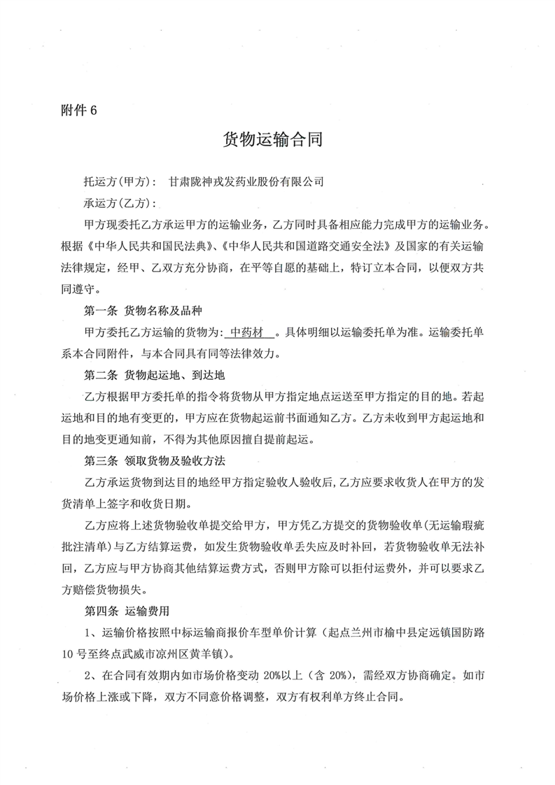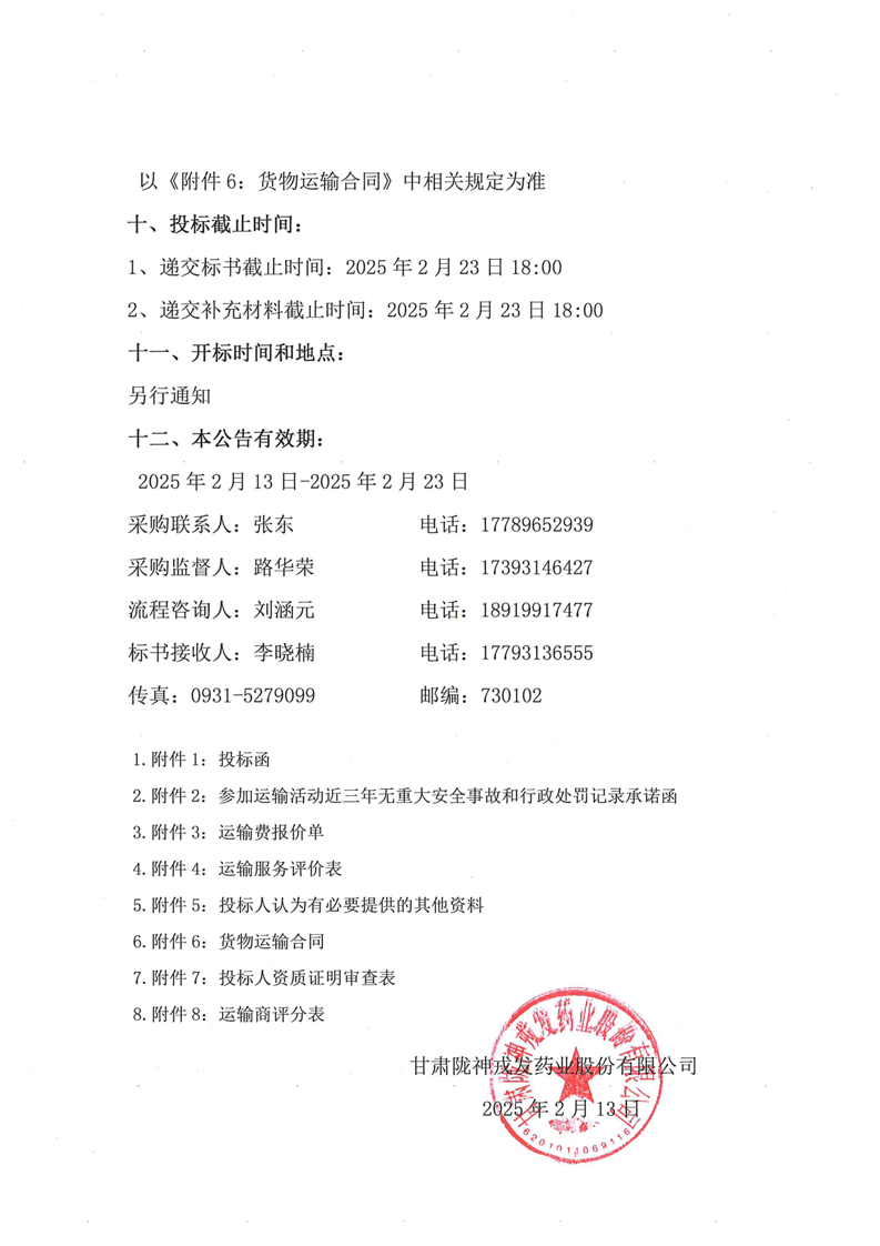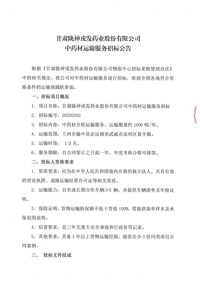 甘肅隴神戎發(fā)藥業(yè)股份有限公司中藥材運(yùn)輸服務(wù)招標(biāo)公告