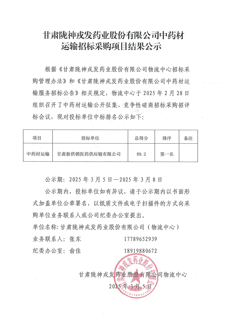 甘肅隴神戎發(fā)藥業(yè)股份有限公司中藥材運(yùn)輸招標(biāo)采購(gòu)項(xiàng)目結(jié)果公示