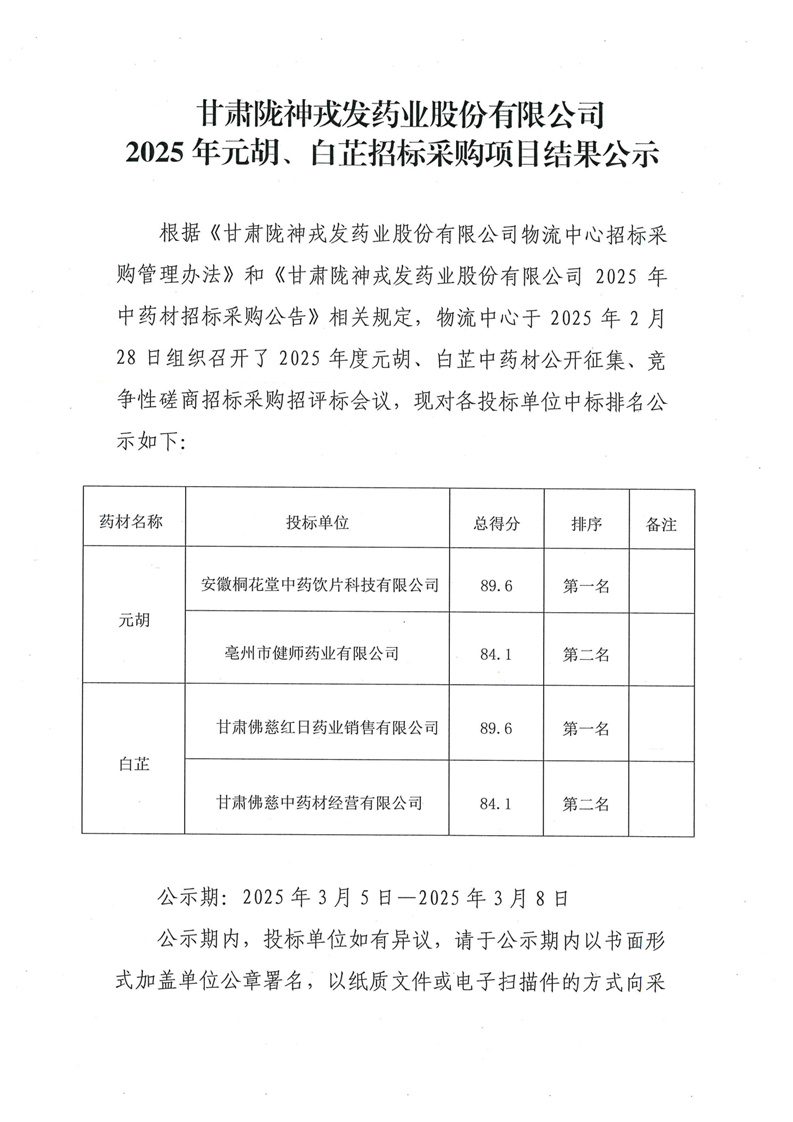 甘肅隴神戎發(fā)藥業(yè)股份有限公司2025年元胡、白芷招標(biāo)采購項目結(jié)果公示
