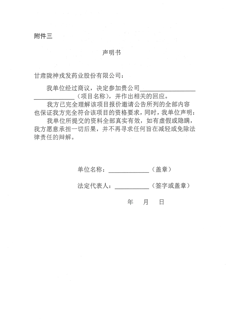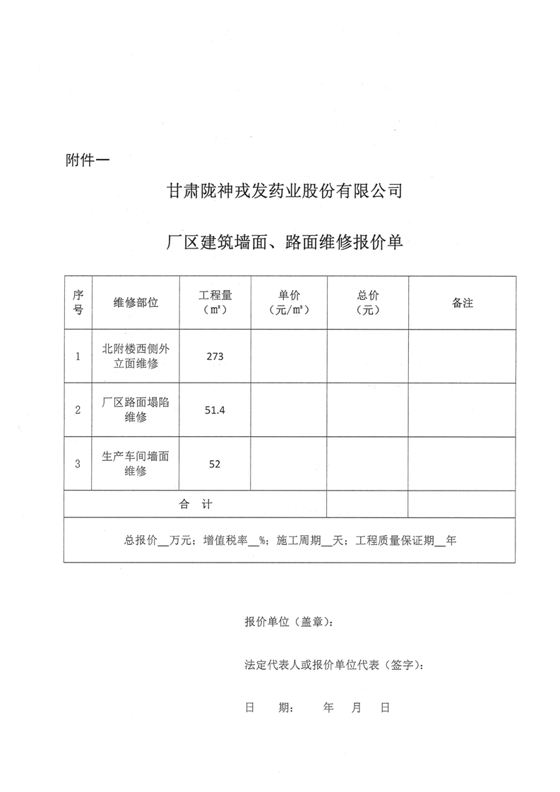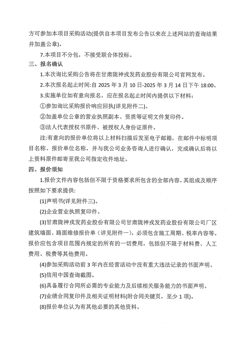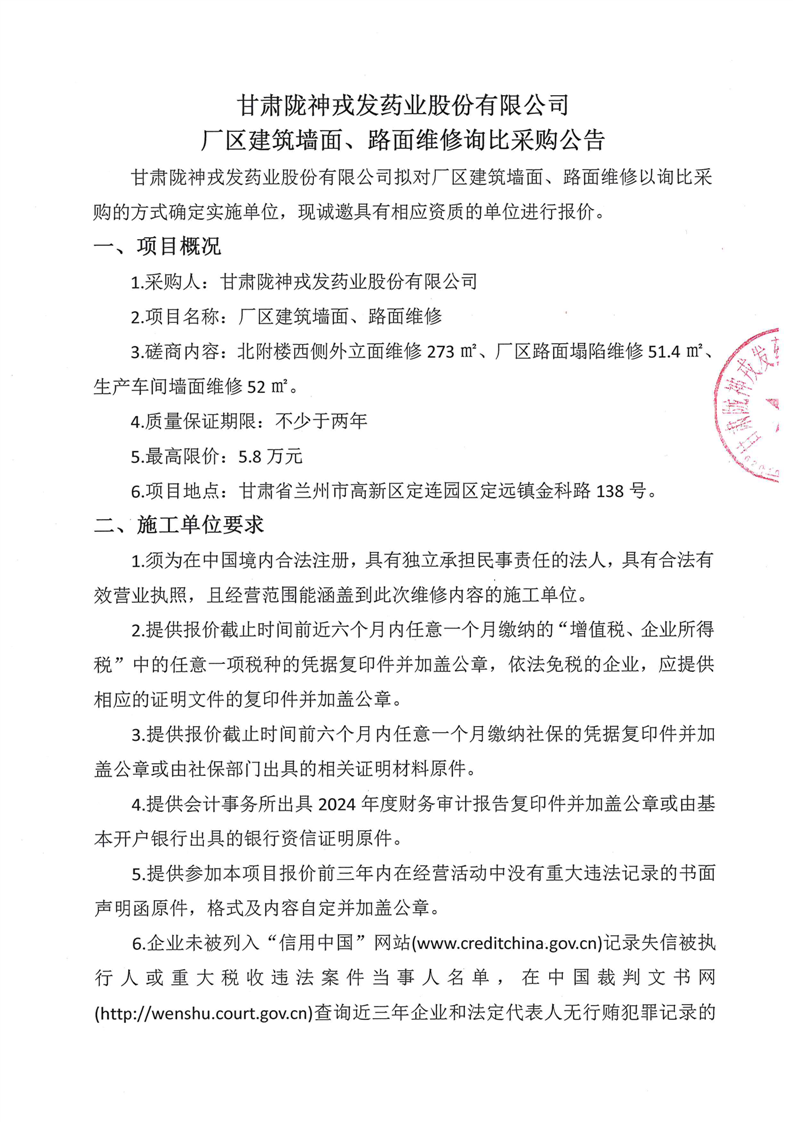 甘肅隴神戎發(fā)藥業(yè)股份有限公司廠區(qū)建筑墻面、路面維修詢比采購公告