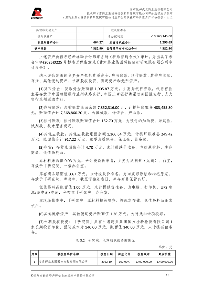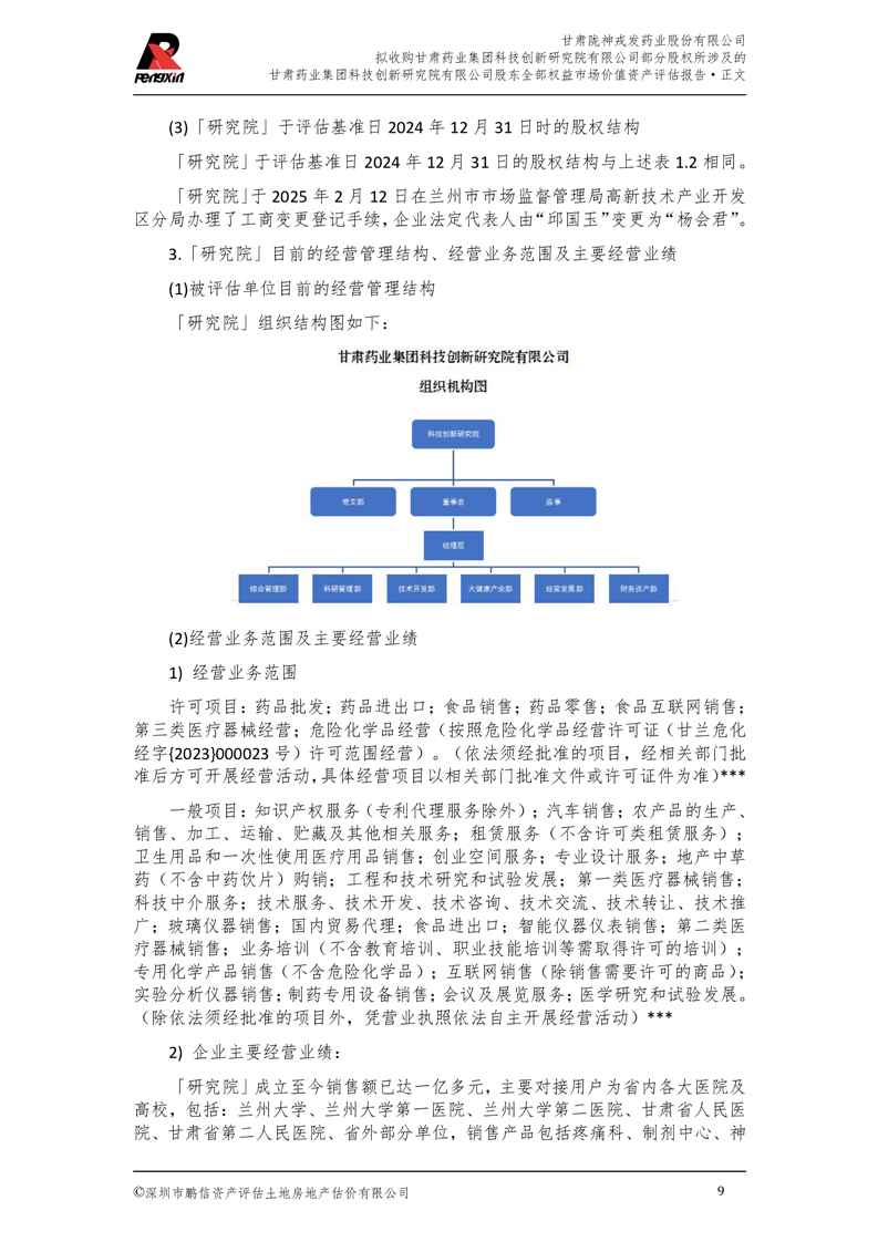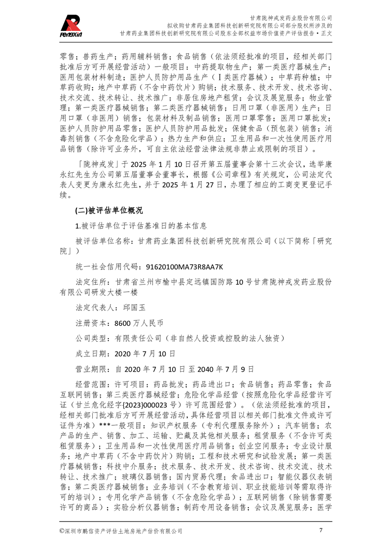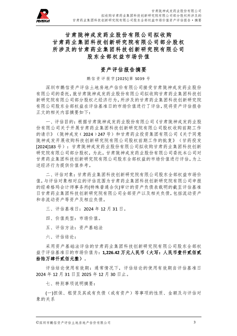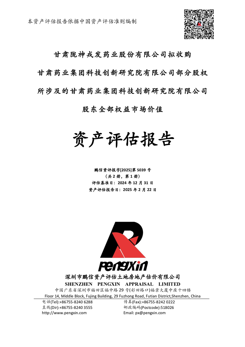 甘肅藥業(yè)集團(tuán)科技創(chuàng)新研究院有限公司股東全部權(quán)益市場(chǎng)價(jià)值資產(chǎn)評(píng)估報(bào)告(鵬信資評(píng)報(bào)字[2025]第S039號(hào))