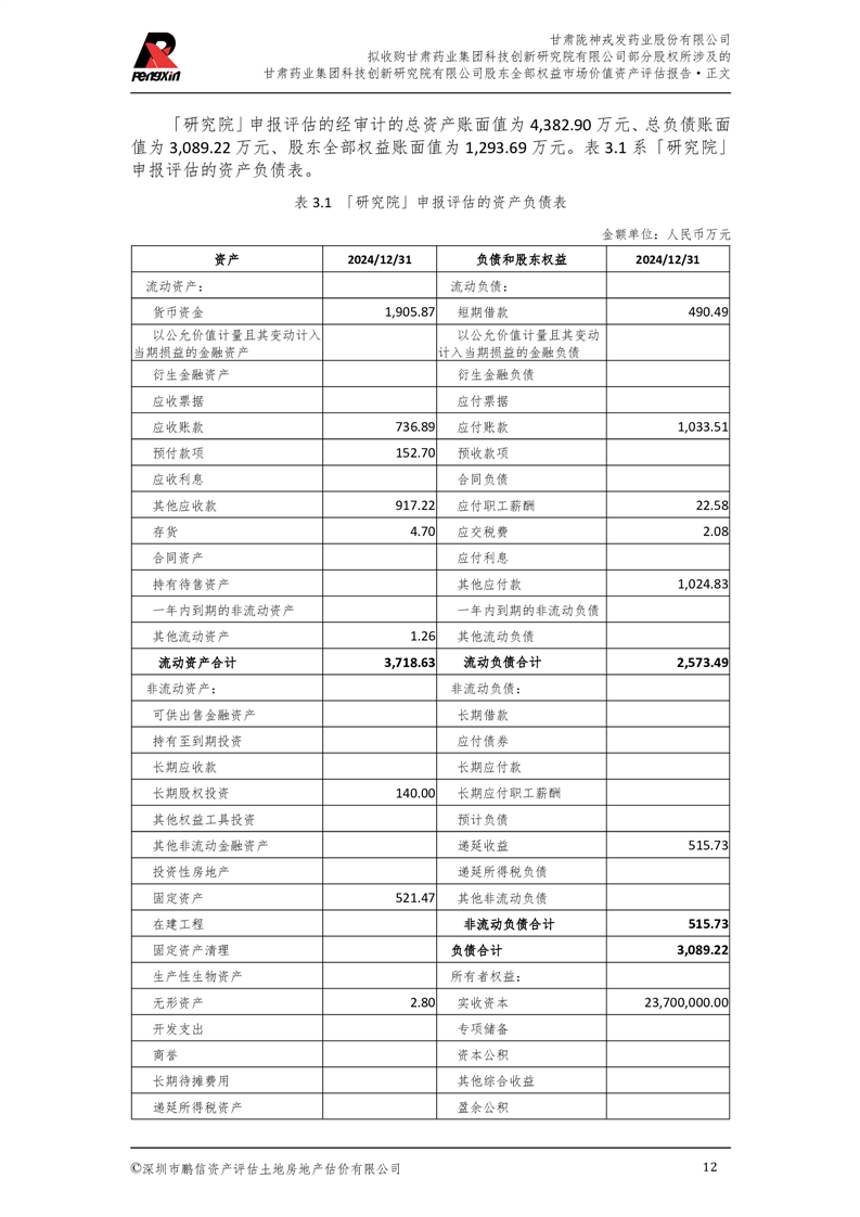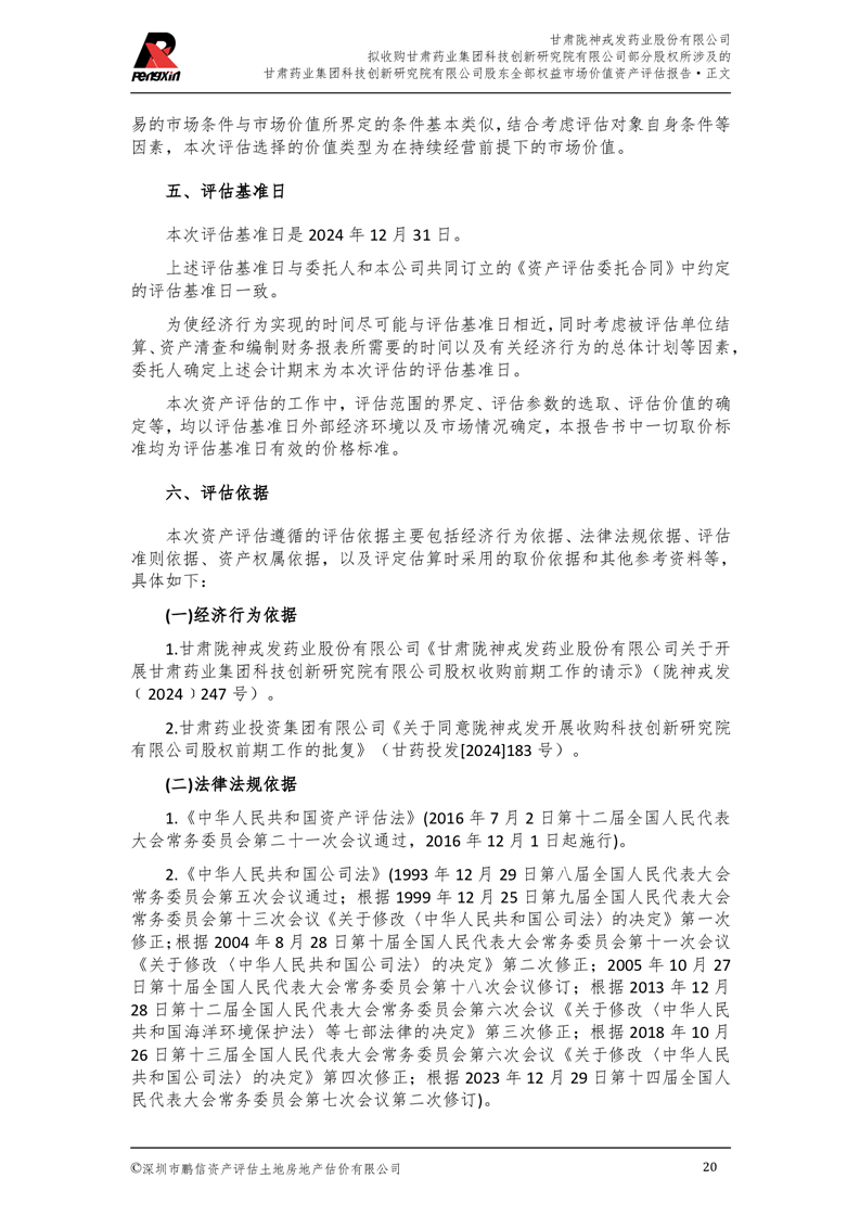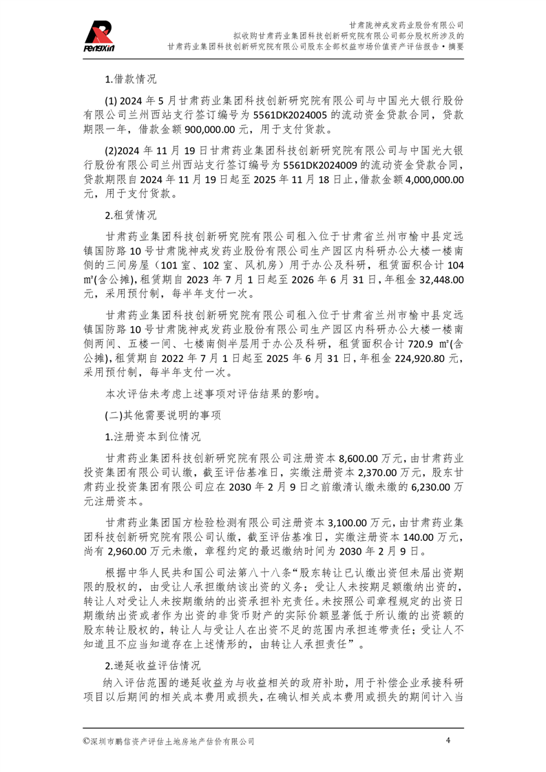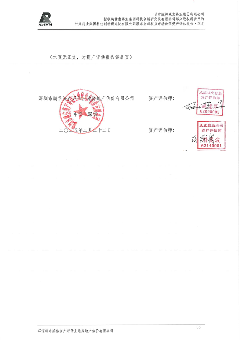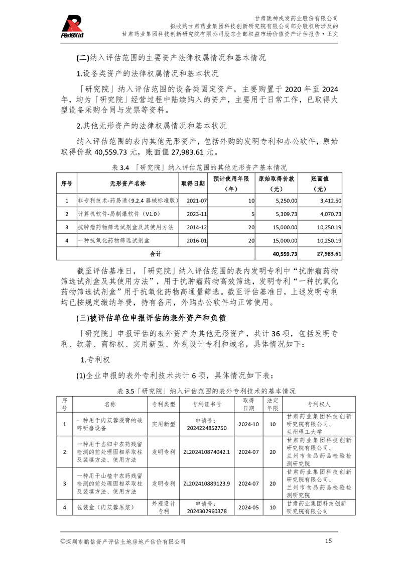 甘肅藥業(yè)集團(tuán)科技創(chuàng)新研究院有限公司股東全部權(quán)益市場(chǎng)價(jià)值資產(chǎn)評(píng)估報(bào)告(鵬信資評(píng)報(bào)字[2025]第S039號(hào))