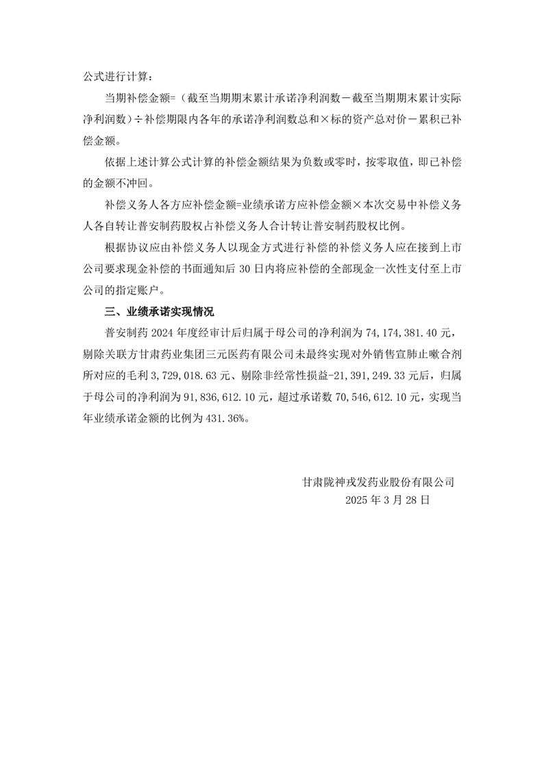 甘肅普安制藥股份有限公司2024年度業(yè)績承諾完成情況的專項說明