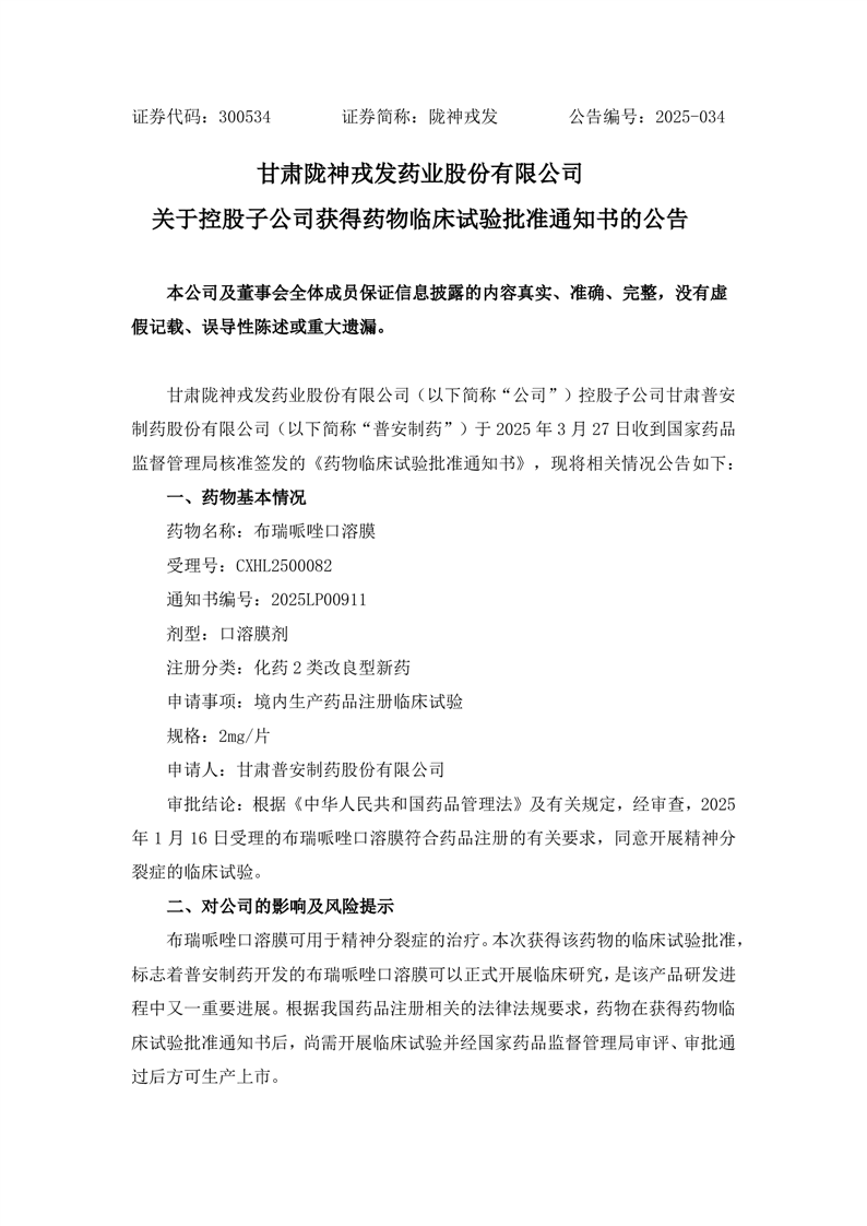 關(guān)于控股子公司獲得藥物臨床試驗批準通知書的公告