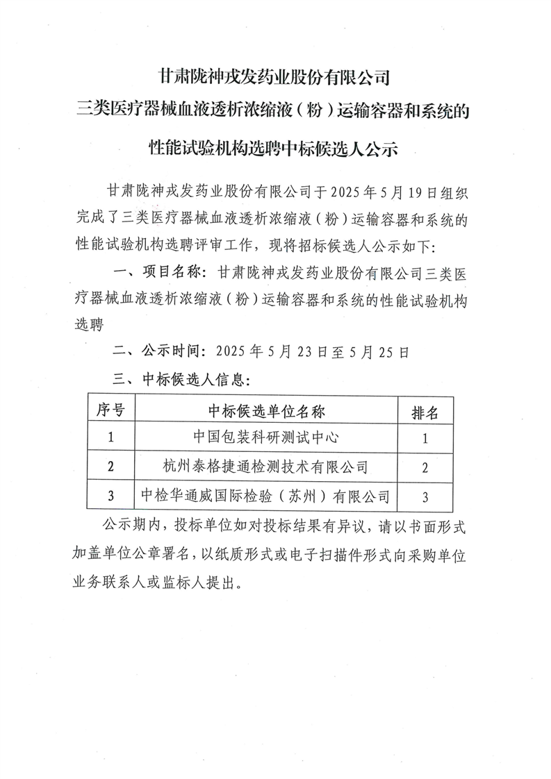 甘肅隴神戎發(fā)藥業(yè)股份有限公司三類醫(yī)療器械血液透析濃縮液(粉)運(yùn)輸容器和系統(tǒng)的性能試驗(yàn)機(jī)構(gòu)選聘中標(biāo)候選人公示